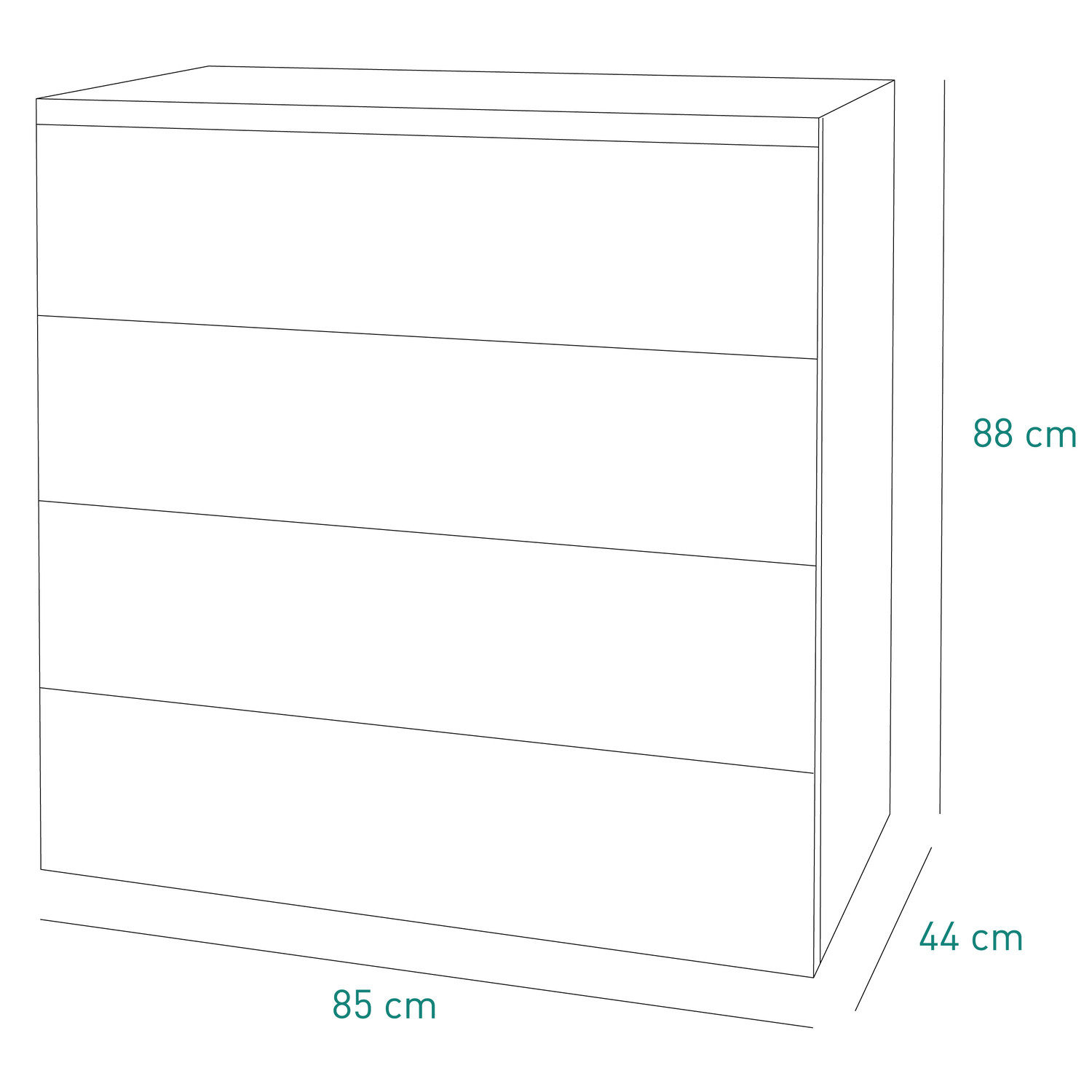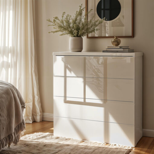 שידת 4 מגירות בעיצוב אלגנטי בצבע לבן לכה — פתרון אחסון פרקטי ויוקרתי לכל חלל בבית.